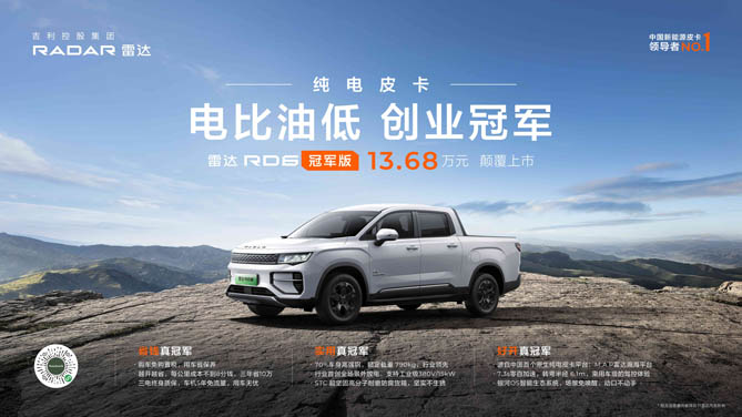 8月1日,吉利雷达正式推出雷达RD6冠军版车型,售价仅为13.68万元,不仅再次刷新了车系的入门价格,也以强大的竞争力优势,切入主流传统燃油皮卡的主销价格区间,再次引领了皮卡行业电比油低的潮流。雷达RD6冠军版车型在保持主要核心配置不变的基础上,提供了更为卓越