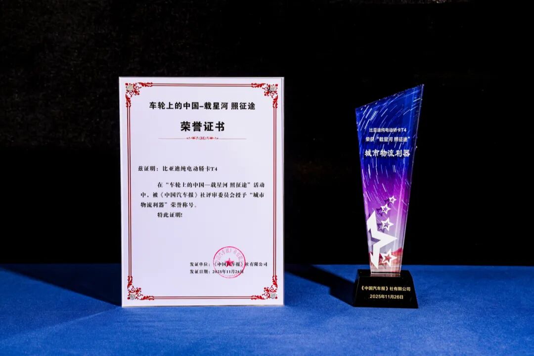 近日,比亚迪在《中国汽车报》社主办的“车轮上的中国——载星河、照征途”年度颁奖盛典中获“全球化领军企业”称号,旗下车型纯电轿卡T4凭借革命性的技术突破,获“城市物流利器”称号,e-BUS平台3.0获“新能源技术专家”称号,充分彰显比亚迪深厚的技术积累与创新成果