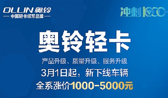 近日,记者从中国奥铃多地经销商和工作人员处得知:自2021年3月1日起,奥铃轻卡新下线车辆全系产品价格将上调,根据不同车型和配置上调幅度为1000-5000元。