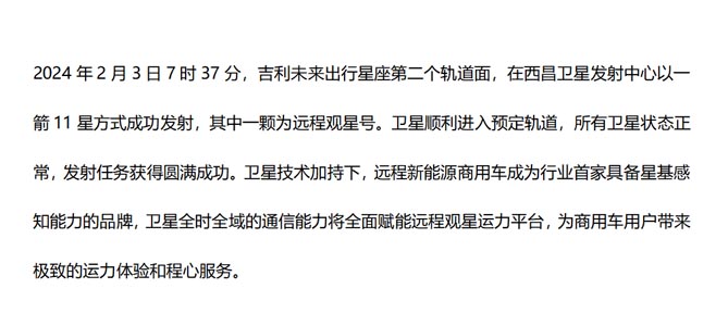 2024年2月3日7时37分,吉利未来出行星座第二个轨道面,在西昌卫星发射中心以一箭11星方式成功发射,其中一颗为远程观星号。卫星顺利进入预定轨道,所有卫星状态正常,发射任务获得圆满成功。卫星技术加持下,远程新能源商用车成为行业首家具备星基感知能力的品牌,卫星