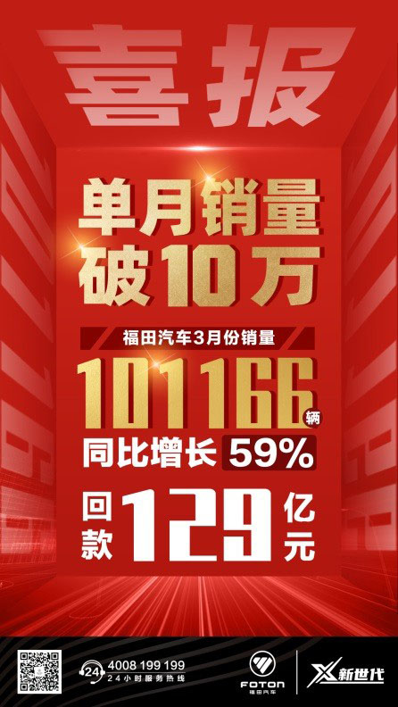 全力冲刺决胜未来,昂首阔步迈向新征程。3月福田汽车销售数据显示,继1~2月连续冲高,福田汽车3月销量再现爆发式增长,当月销量大破10万辆大关,回款达129亿元,刷新了同期销量及回款最高历史纪录,创福田汽车25年业绩最高纪录,公司各项经营指标快速向上攀升。