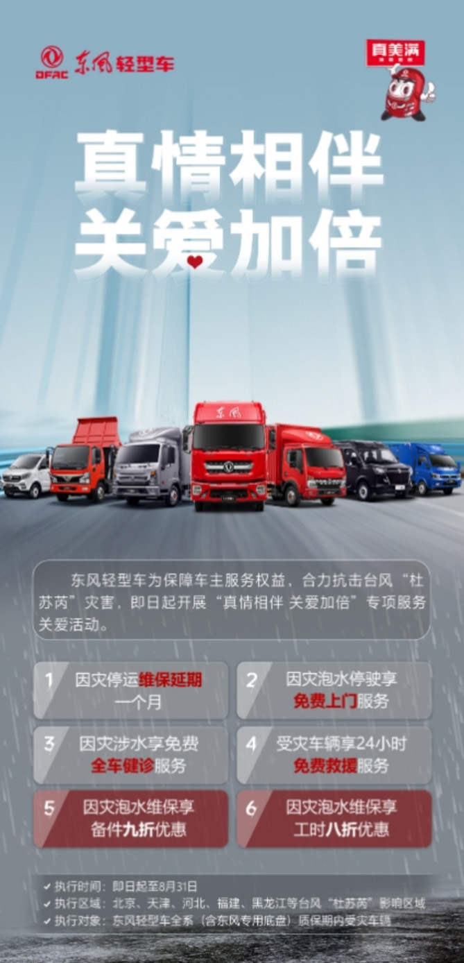 东风轻型车满怀赤诚之心,愿为受灾人民尽绵薄之力,即日起至8月31日,东风轻型车全力开展“真情相伴 关爱加倍”活动,因灾停运的东风轻型车卡友享维保延期一个月、因灾泡水停驶享免费上门服务等,6大举措,全力关怀,最大程度保障卡友出行运输安全。