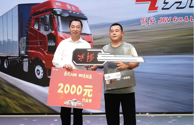 ▲一汽解放销售公司副总经理霍明为J6V 530马力LNG牵引车客户颁发交车钥匙