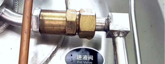 紧接着是进液阀,进液阀也叫进液单向阀,它是单方向流动的,有了它就可以阻止加入气瓶内的液体流出了。
