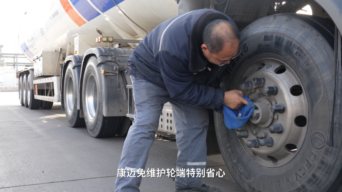 康迈免维护轮端采用齿轮油润滑设计,在散热性能和流动性方面表现更稳定。孙总对比了使用体验:“最早使用的脂润滑轮端,夏天容易过热;康迈免维护轮端油润滑,长时间运行温度很稳定,有效避免了传统脂润滑在高温工况下易发生的轮毂过热、烧轴等风险。即便在低温地区,齿轮油也能保持充分润滑,确保车辆启动顺畅,运行平稳。”