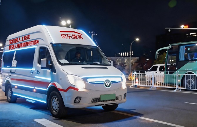 测试现场,一辆车身印有“机器人救护车”标识的纯电轻客在赛道上忙碌巡场。当有机器人在比赛中“受伤”无法完赛时,这辆“救护车”便第一时间赶到现场,将“伤员”运走——这一幕被观众拍下后迅速在社交网络传播,成为测试当天一大“爆点”。而这辆引发全网好奇的“机器人救护车”,正是福田图雅诺。