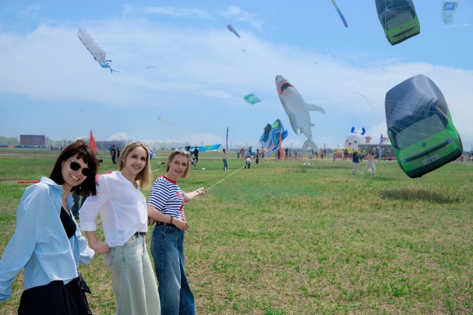 最热闹的一幕发生在风景i的放飞体验环节。三位来自澳大利亚的美女游客主动请缨,亲手尝试放飞风景i风筝。三人一起抓住风筝线,在工作人员的指导下喊着“One, Two, Three, go!”,巨型风筝应声升空。三人激动得击掌欢呼,周围观众纷纷鼓掌,场面欢乐十足。