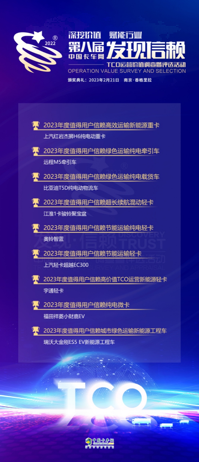 其中,上汽红岩杰狮H6纯电动重卡荣获2023年度值得用户信赖高效运输新能源重卡奖项;远程M5牵引车获得2023年度值得用户信赖绿色运输纯电牵引车奖项;2023年度值得用户信赖绿色运输纯电载货车奖项被比亚迪T5D纯电载货车获得;江淮1卡骏铃聚宝盆成功摘得2023年度值得用户信赖超长续航混动轻卡奖;荣获2023年度值得用户信赖节能运输纯电轻卡奖项的则是奥铃智蓝;上汽轻卡超越EC300获得2023年度值得用户信赖节能运输轻卡奖!宇通轻卡获得2023年度值得用户信赖高价值TCO运营新能源轻卡;瑞沃大金刚ES5 EV新能源工程车荣获 2023年度值得用户信赖城市绿色运输新能源工程车奖项!