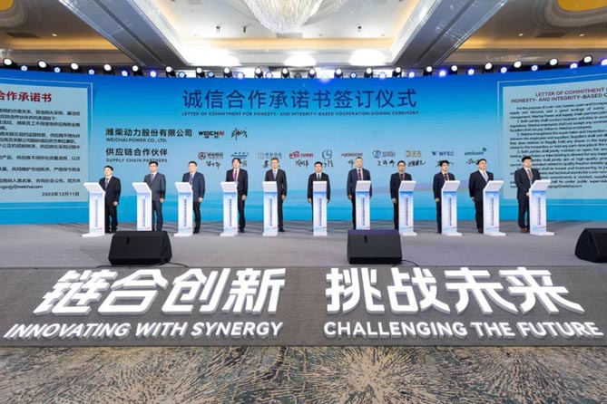潍柴动力CEO、总经理王德成与10家供应商代表签订诚信合作承诺书。