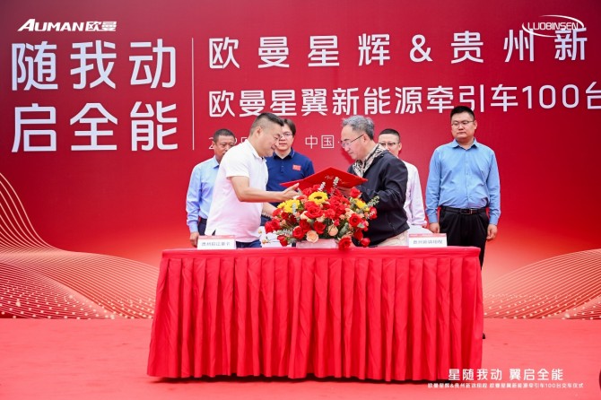 9月23日,以“星随我动 翼启全能”为主题的欧曼星翼新能源牵引车100台交车仪式在贵州六盘水隆重举行。现场欧曼星辉与客户代表成功签约,100台欧曼星翼400kWh新能源牵引车正式交付。本次签约及批量交付,不仅体现出欧曼星翼新能源牵引车在物流运输业及商用车市场的高度认可,更验证了欧曼在新能源技术领域的强劲实力,赋予贵州乃至全国物流运输适配多场景的绿色动能,引领新能源牵引车行业迈向新时代发展新高度。